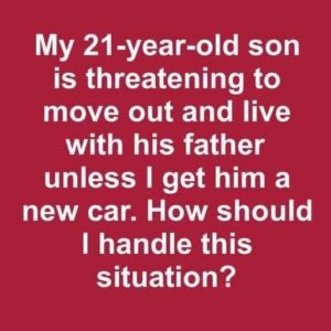 “My 21-year-old son is threatening to move out and live with his father unless I get him a new car. How should I handle this situation?” …