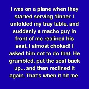 I was on a plane when they started serving dinner. I unfolded my tray table, and suddenly a macho guy in front of me reclined his seat….