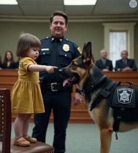 At first, no one noticed. Her small fingers trembled slightly, suspended in the heavy air. Then her arm stretched forward with the certainty of instinct. She pointed directly at the dog.