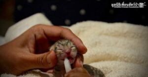 The kitten was only a few hours old when he was found by the family, as was determined by WFFT. The organization’s experts were perplexed by the mother’s apparent willingness to forsake her newborn.