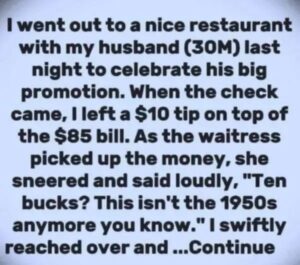 When the check came, I left a $10 tip on top of the $85 bill. As the waitress picked up the money, she sneered and said loudly, “Ten bucks? This isn’t the 1950s anymore, you know.”
