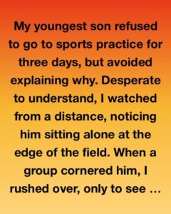 My youngest son skipped three days of sports practice without expressing why. I observed him sitting alone at the field edge from afar, desperate to comprehend. I ran to him as a gang cornered him, but they scattered like birds.